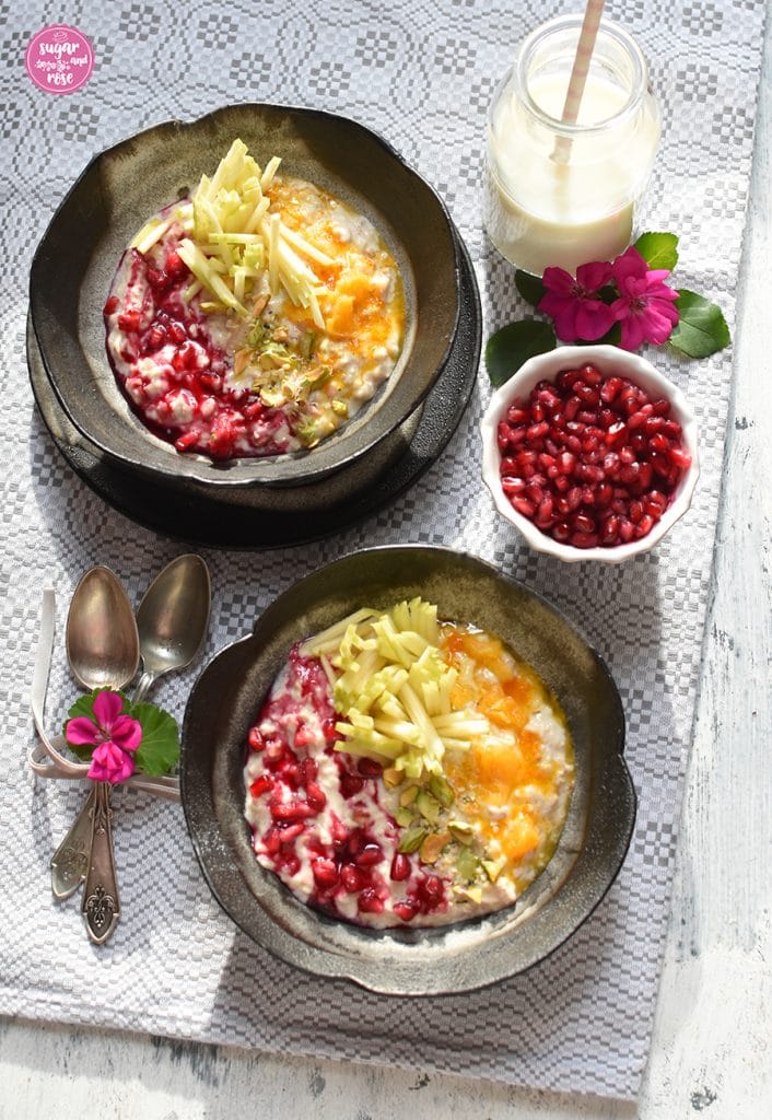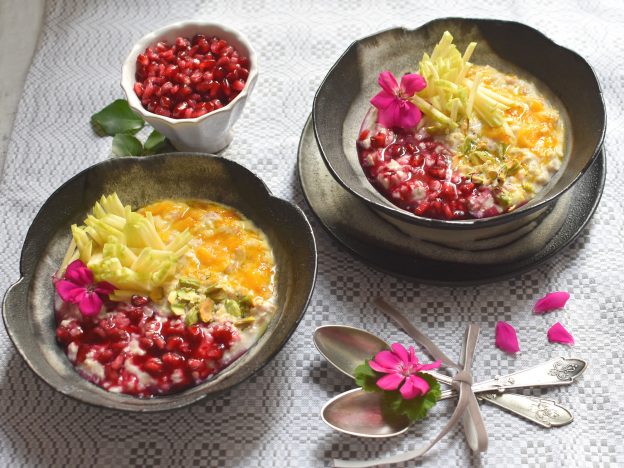 Am Wochenende wird mein Birchermüsli mit Granatapfel und Orangensirup getoppt. Die Äpfel werden in dekorative Stifte geschnitten, Samen und Pistazien farbig auf die Früchte abgestimmt und die leuchtend roten Granatapfelkerne auf eingedicktem, frischem Granatapfelsirup serviert. Welch Farbenspiel! Da geht bei mir trotz Winterwetter die Sonne auf.