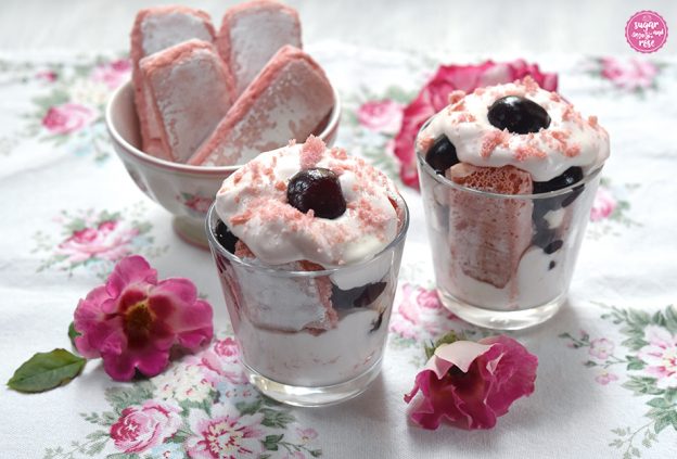 Ersatzweise können für das Kirschdessert auch große Biskotten oder Löffelbiskuits verwendet werden. Die rosa Farbe der Biscuits Roses macht Desserts allerdings erst königlich. Oder sollte ich besser sagen: märchenhaft, prinzessinnentauglich?