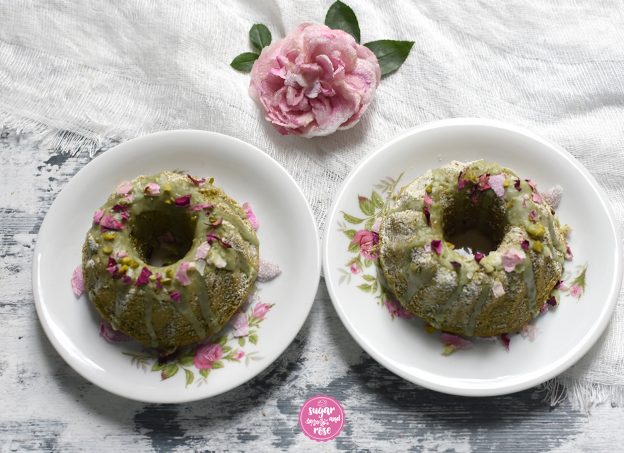 Und auf den dadurch entstandenen kleinen Plateaus habe ich je einen Tupfen Mascarponecreme und eine halbe Himbeere platziert. Aus dem Gugelhupf wurde ein Törtchen. Mit der rosa Ranunkel on the top sogar ein Feiertagstörtchen.