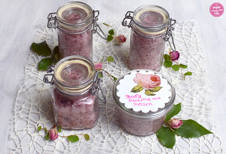 Salz und Zucker mit den Rosenblüten im Cutter fein mahlen, Rosenöl ins Mandelöl tropfen (ev. Farbstoff für eine rosa Färbung beigeben) und mit den restlichen Zutaten vermischen.