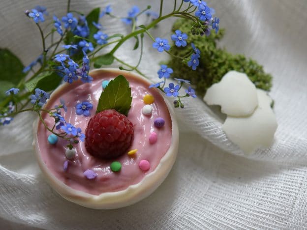 Die frischen Himbeeren geben der Frischkäsecreme ganz ohne Zusätze einen wunderschönen Rosaton, Rosenzucker oder etwas Rosenöl eine zartes Rosenaroma.