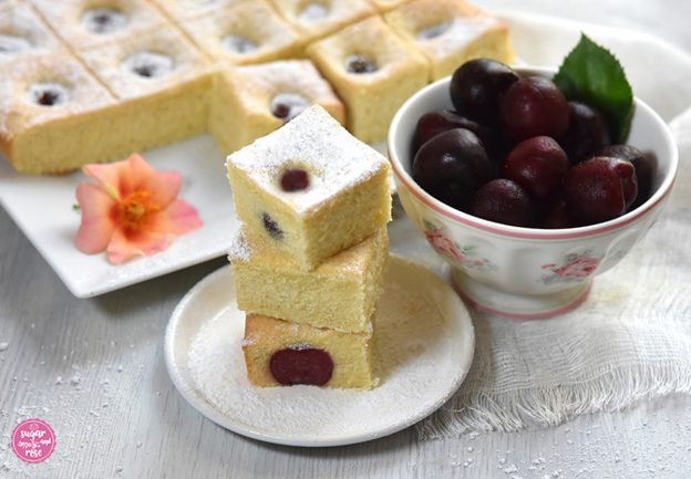 Je nach Saison belege ich den Kuchen mit Heidelbeeren, Kirschen, Marillen, Pfirsichen, Zwetschken (in Deutschland Zwetschgen) oder auch Apfel- und Birnenspalten. Ich habe auch schon Mangos und Ananas probiert. Einzig Erdbeeren sind etwas zu wässrig dafür. Passend zum Obst aromatisiere ich den Teig mal mit Vanille, Zitronenzesten, Rosenwasser oder in Kombination mit Äpfeln auch mit Zimt.