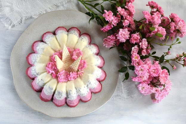 Zum Dahinschmelzen so ein Eisgugelhupf. Raffiniert in seiner Form, vielfältig die unterschiedlichen Schichten mit Mohn und Himbeeren, nicht zu süß durch Skyr und Honig … Ein Eisgugelhupf sorgt immer für gute Laune, auch bei miesem Wetter. Und obwohl ein Eis nie und nimmer geteilt wird, dürfen beim riesigen Eisgugel auch Freunde mitnaschen.