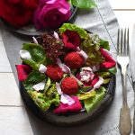 Himbeer-Frischkäsebällchen auf Rosensalat - Unser Gemüsekistl – aus einer kleinen, nachhaltig produzierenden Landwirtschaft (thinkofnature) – war diese Woche voll mit knackfrischen Salaten: rotem Eichblatt-, Romanasalat, Spinat und diesem wunderschönen, rot-grün gesprenkelten Forellenschluss-Salat. Warum gibt es diese schmackhaften alten Sorten nur mehr auf Spezialmärkten zu kaufen? Früher wuchsen sie in jedem Bauerngarten … „Forellenschluss“ schmeckt kräftiger als Kopfsalat, leicht süßlich und […]