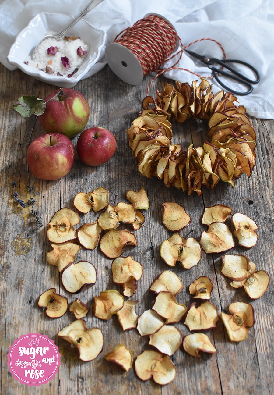 Natürlich kann ich nicht alle Äpfel zu Kuchen oder Strudel verarbeiten. Apfelmus und Bratapfelmarmelade sind schon fertig. Also werden Unmengen Äpfel getrocknet, um über den Winter zu kommen. Es gibt keine bessere Alternative zu Süßigkeiten als Apfelchips. En nature natürlich!