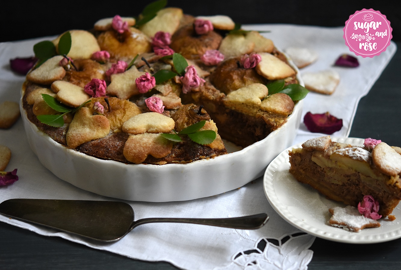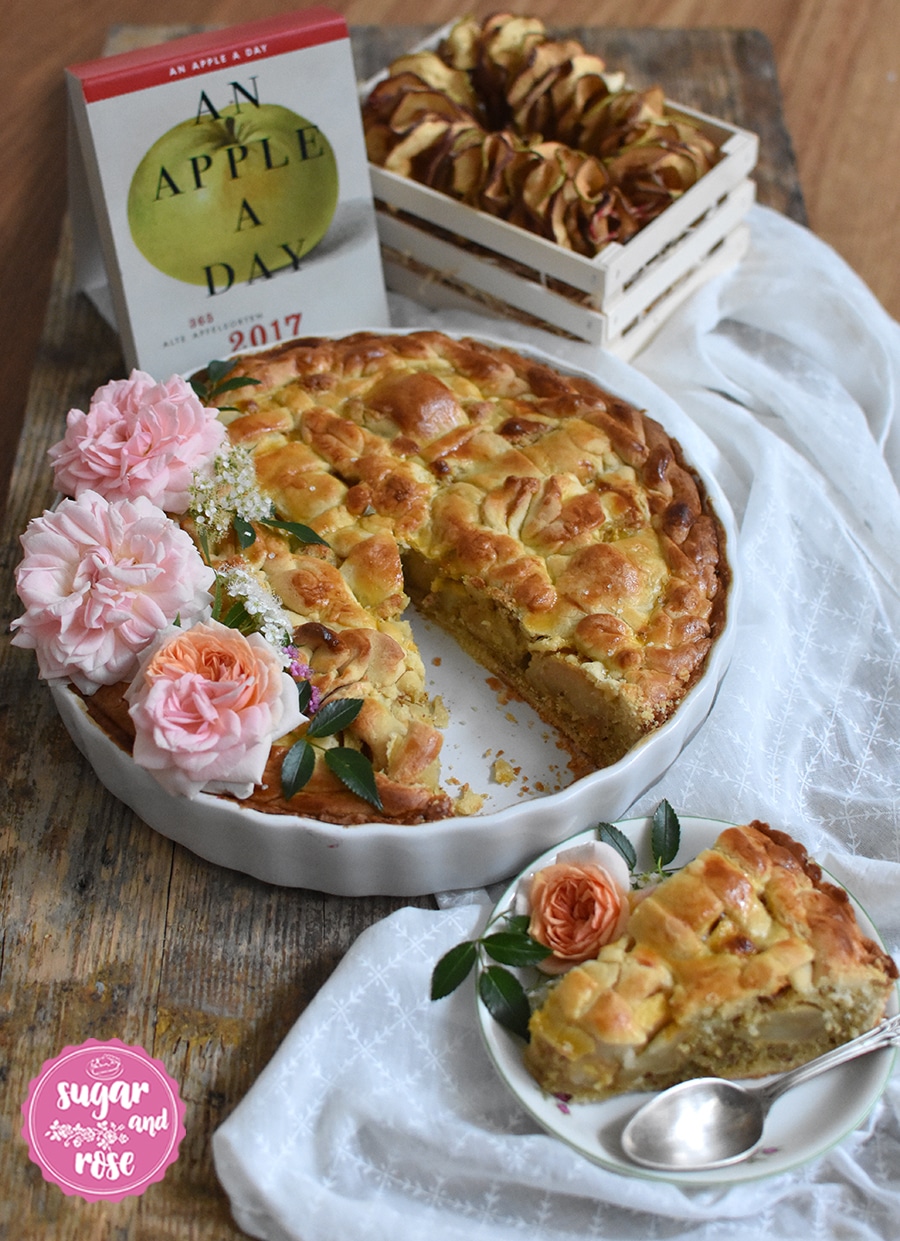 Für meine APFELTARTE habe ich Schawana verwendet, aber auch Boskoop eigenen sich recht gut. Zusammen mit der Rosen-Mandel-Pistazien-Creme ist der Mürbteigkuchen richtig fein geworden. Da braucht es weder Zimt noch andere Gewürze als Geschmacksverstärker. Die alten Äpfel allein verleihen dem Kuchen ein herrliches Aroma. Beim Probieren musste ich gerade an Omas gedeckten Apfelkuchen denken …