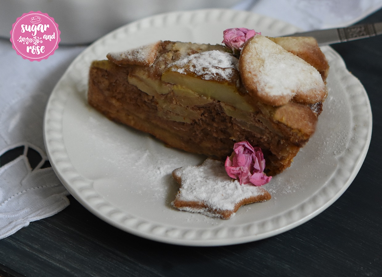 Natürlich backe ich mit heimischen Walnüssen, wodurch der Teig besonders mürbe und saftig wird. Damit das Kucheninnere nicht nur aus riesigen Äpfeln besteht, habe ich die Tarte mit einer Apfel-Nussmischung gefüllt und erst am Backende Äpfelhälten mit Stiel aufgesetzt. So ist der Geschmack der Bratäpfel voll da, das Innenleben aber ein würziger, schnittfester Kuchen. Für die Füllung habe ich die für Bratäpfel typischen Gewürze wie Zimt, gemahlene Nelken und auch ein wenig Bittermandelaroma beigemengt.