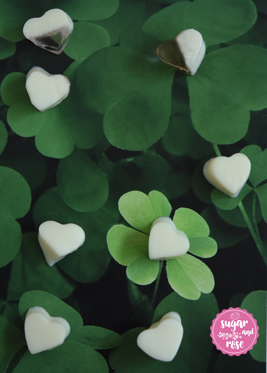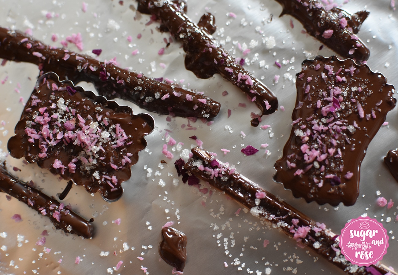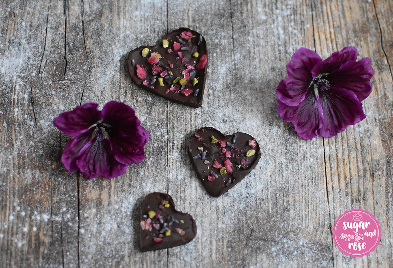 Weil noch flüssige Schokolade übrig war, habe ich diese in herzförmige Keksformen eingegossen und mit kandierten Rosenblütenblättern, Lavendel und Pistazien dekoriert. Die Herzen und übrigen Schokoblätter habe ich als Tischdekoration verwendet.
