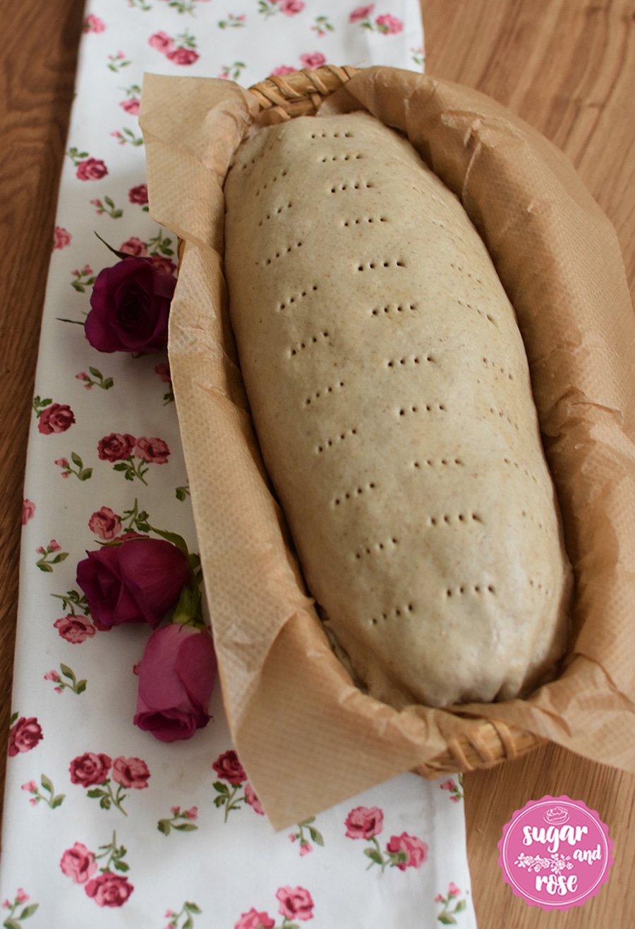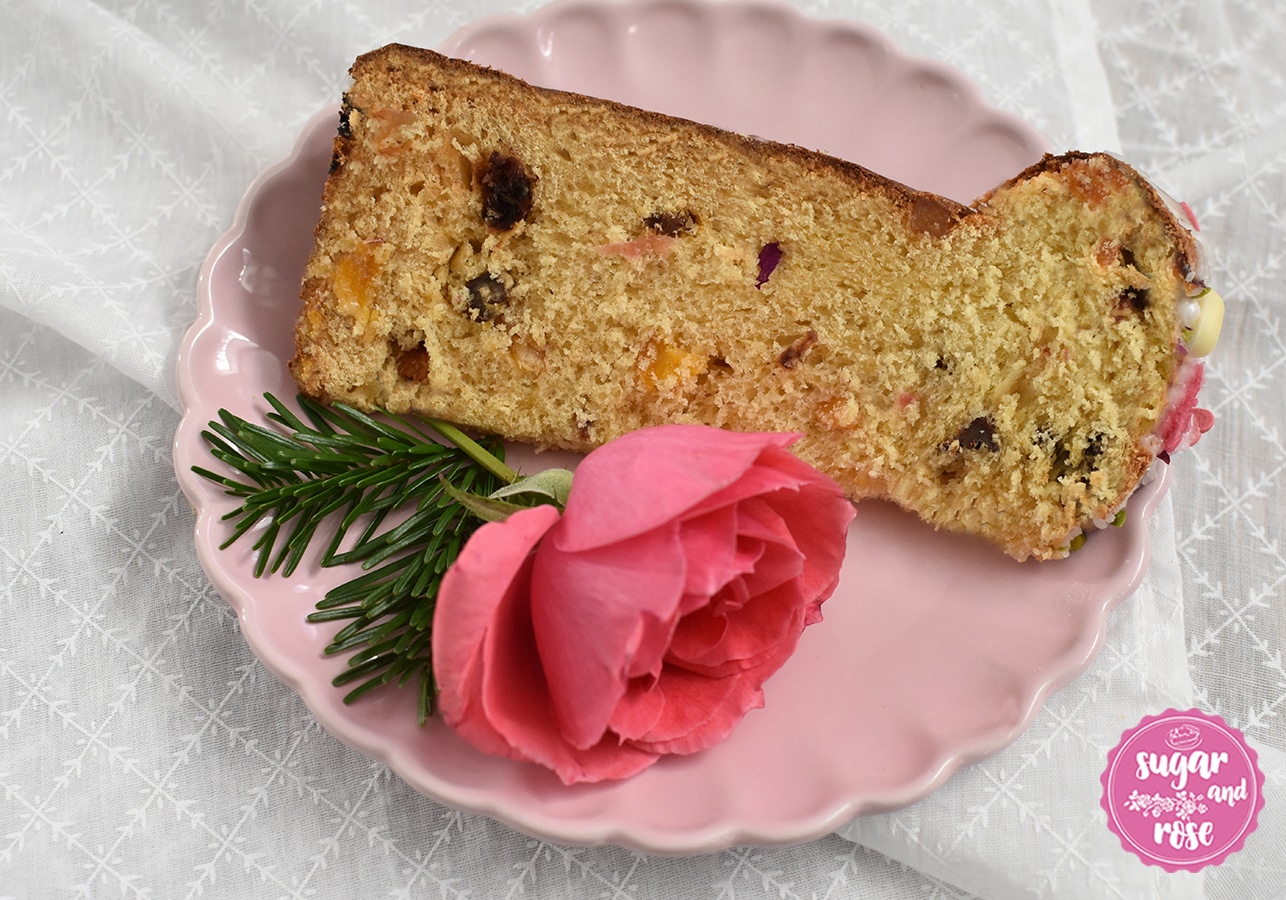 Gekaufte Panettone, die wochenlang in den Supermärkten steht, schmeckt meist etwas fad und ist oftmals nur mit Orangeat und Zitronat gefüllt. Ich habe eine ordentliche Menge getrocknete und in Weinbrand eingelegte Marillen, Kletzenbirnen, Kirschen und kandierte Orangenschalen unter den Teig gemischt, damit dieser schön saftig wurde und die Oberfläche noch mit kandierten Rosenblüten, Zuckerperlen, Pistazien und weißen Schokoherzen bestreut.