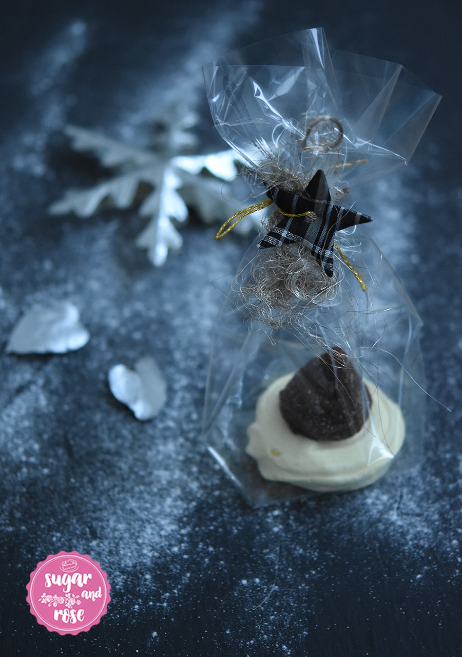 Durch den roten Stern werden die Maronizapfen alsgleich zum Weihnachtsbäumchen. Für die Schokoladentiger habe ich sie mit Küfferle-Katzenzungen bestückt. Und der Silberglimmer lässt sie zum Weihnachtsfest erstrahlen.