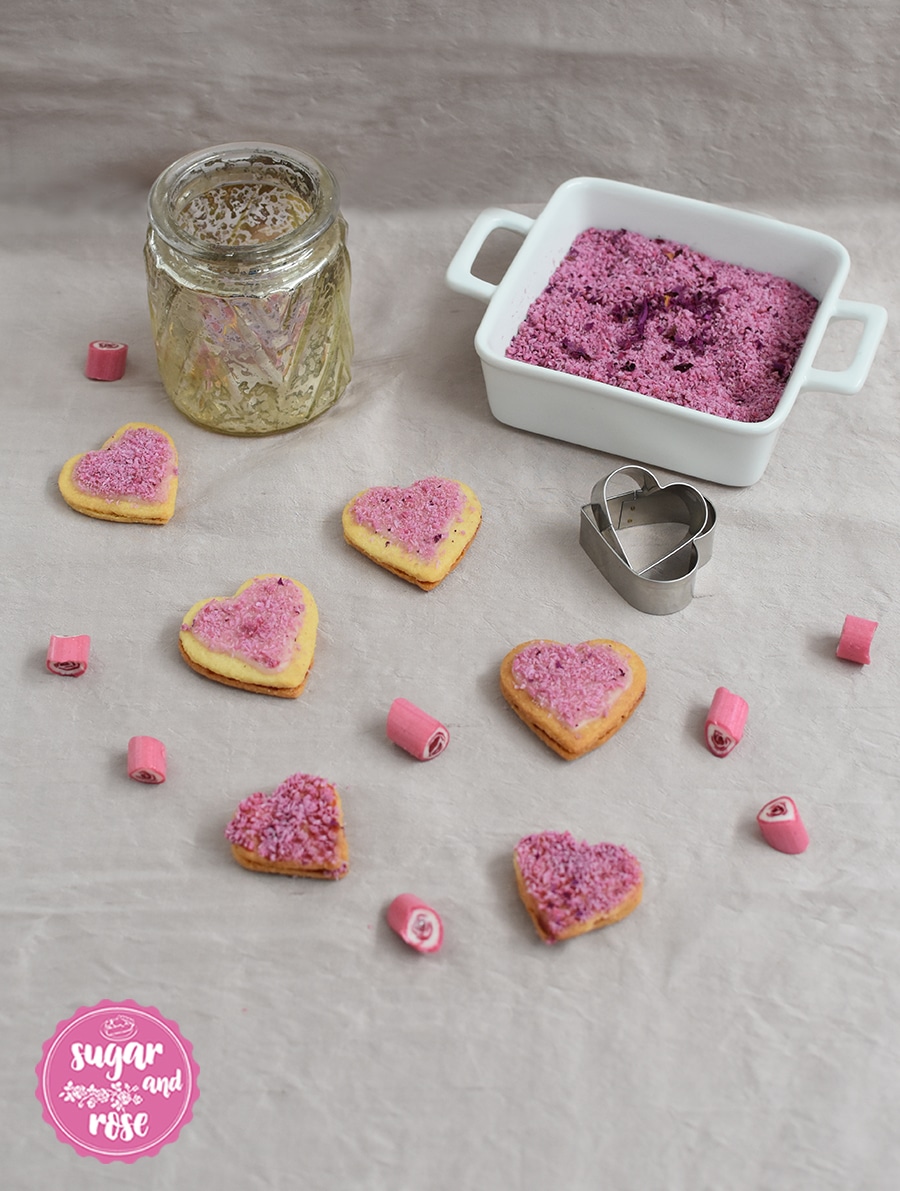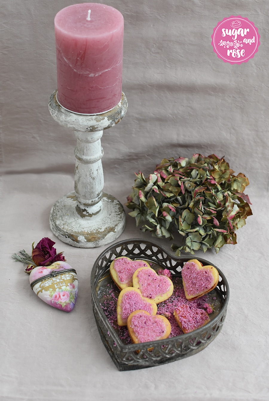 Rosa sollten sie natürlich sein, meine Herzen. Daher habe ich die Kokosflocken mit Himbeeren rosarot eingefärbt und im Backrohr getrocknet, danach noch mit pinkfarbenen Rosenblüten vermischt. Die Glasur ist aus Rosensirup und Zucker.