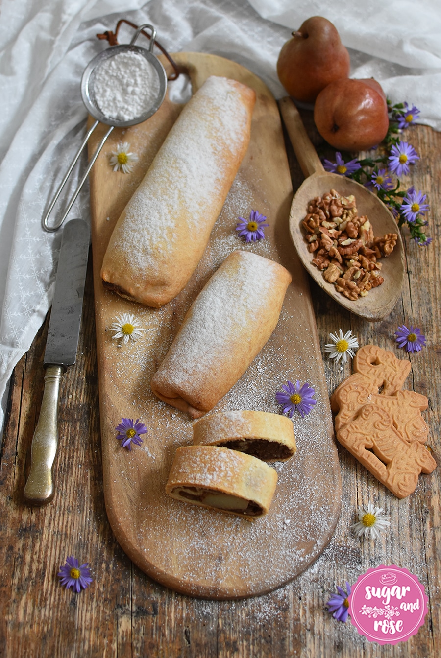 Heute habe ich ihn mit frischen Birnen gefüllt, die ich zuvor in Zimt-Zucker karamellisiert habe. Kurz habe ich überlegt, ob ich Lebkuchen oder Spekulatius den Vorzug gebe. Mit Lebkuchen habe ich im Vorjahr einen traumhaften Weihnachtsstrudel gebacken. Nun, die Spekulatius haben gewonnen. Zerbröselt und mit einer Schokolade-Walnuss-Maroni-Creme vermengt, umhüllen sie die zimtigen Birnen. Noch warm mit ein wenig Zimtbirnenkaramell serviert – unwiderstehlich!