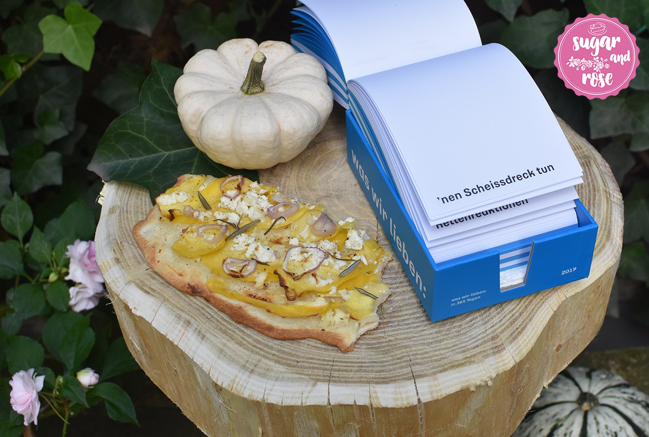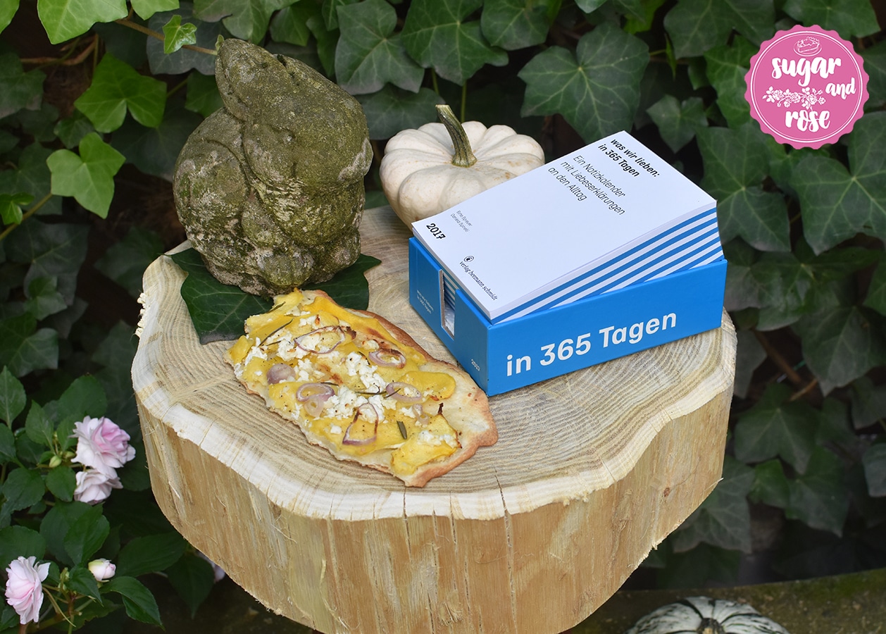 Da musste ich gleich nachschlagen, was an meinem Geburtstag 2017 steht: „’nen Scheissdreck tun“ – das wird ja immer besser. Also habe ich mich mit dem frischen Kürbis-Feta-Flammkuchen in den Garten gesetzt, ihn mit den Fingern verspeist und danach genau das getan, was er mir – eigentlich erst für nächsten August – angeboten hat: Nix. Gar nix. Nur in der Sonne relaxt.