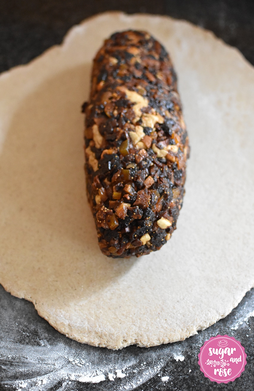 Die Trockenfrüchte habe ich über Nacht mit Rum und Gewürzen ziehen lassen. Damit das Kletzenbrot auch wirklich zum Kletzen-Brot wird und nicht nur zu einer mit Trockenfrüchten gefüllten Teighülle, habe ich eine Teighälfte mit faschierten (im Fleischwolf fein gehackten) Kletzenbirnen verknetet. Dann erst kommt die Trockenfruchtmischung hinzu, schließlich wird dieser Striezel in die ausgerollte zweite Brotteighälfte eingeschlagen. Und ohne Gehzeit gleich ab ins vorgeheizte Rohr.