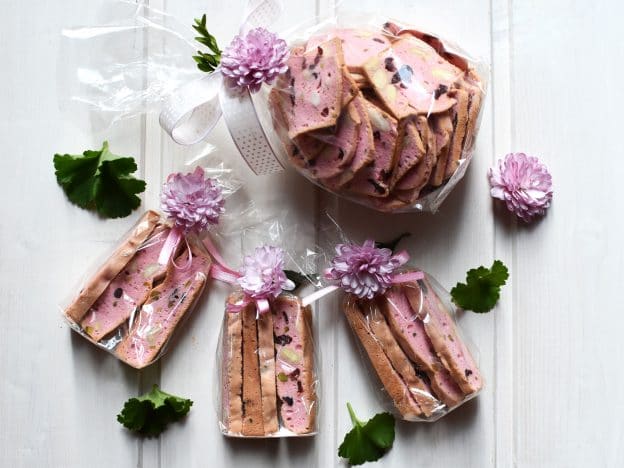 Gekaufte Panettone, die wochenlang in den Supermärkten steht, schmeckt meist etwas fad und ist oftmals nur mit Orangeat und Zitronat gefüllt. Ich habe eine ordentliche Menge getrocknete und in Weinbrand eingelegte Marillen, Kletzenbirnen, Kirschen und kandierte Orangenschalen unter den Teig gemischt, damit dieser schön saftig wurde und die Oberfläche noch mit kandierten Rosenblüten, Zuckerperlen, Pistazien und weißen Schokoherzen bestreut.