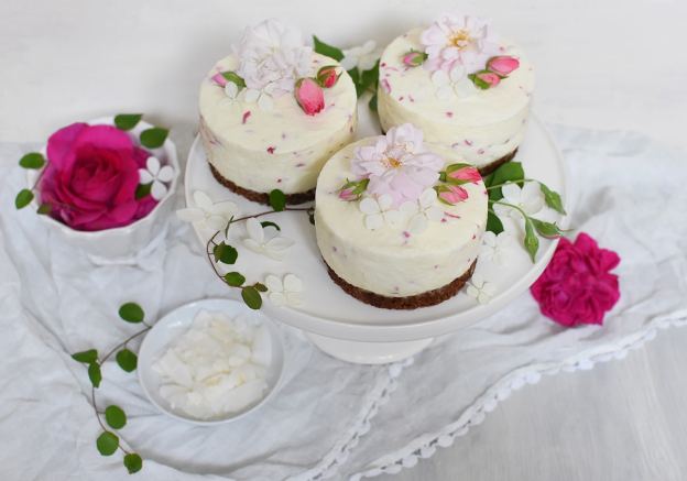 Leicht und erfrischend soll ein Sommerdessert idealerweise sein. Am besten im Miniformat wie mein Rosen-Kokos-Cheesecake. Und gut gekühlt, bevorzugt frozen oder halbgefroren. Zudem darf es bei den heißen Temperaturen nicht zu schwer im Magen liegen, weshalb ich im Moment eher kleine Küchlein statt einer großen Torte serviere. Mit dem Duft nach Rosen sowie dem Geschmack von Kokos schicken uns die Mini-Cheesecakes auf Reisen in orientalische und karibische Urlaubsländer. Für Kalorienbewusste gibt es auch eine fettreduzierte Ausführung und je nach Belieben zwei verschiedene Kuchenböden zur Auswahl, einer davon eine No-bake-Variante.