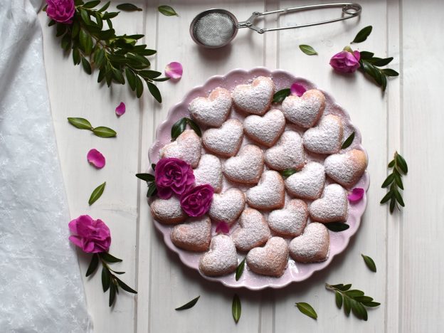Rosa sollten sie natürlich sein, meine Herzen. Daher habe ich die Kokosflocken mit Himbeeren rosarot eingefärbt und im Backrohr getrocknet, danach noch mit pinkfarbenen Rosenblüten vermischt. Die Glasur ist aus Rosensirup und Zucker.
