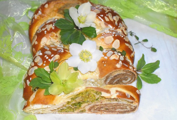 Weil im Garten gerade alles herrlich blüht und grünt, möchte ich die Frühlingsfarben auch in meinen Striezel einbacken. Was ist grün und passt zu einem süßen Teig? – Pistazien. Persische Pistazien sind knallgrün. Leider sind die bei uns erhältlichen eher gelblich, teilweise sogar rötlich-braun. Also habe ich eine Handvoll pürierte frische Babyspinatblätter untergemengt, um ein schönes Frühlingsgrün zu erzielen.