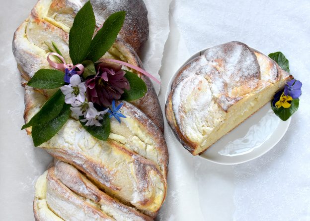 Traditionelles Hefegebäck darf zu Ostern bei uns ebenfalls nicht fehlen. Ohne Pinze geht’s bei meinem Mann nicht, das Patenkind wartet auf sein Osterkipfel, die Nichte möchte zum Brunch ein Osterbrot und ich liebe Brioche und Hefezopf. Zur Abwechslung habe ich am Wochenende den süßen Hefeteig zu Rosen gedreht und im „Reindl“ (österreichisch für kleine flache Pfanne) gebacken.
