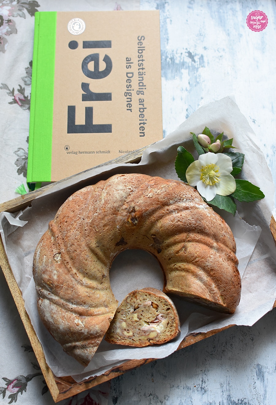 Ich liebe Experimente in der Küche ebenso wie im Job. Mut und Experimentierfreude bedarf es auch, wenn man sich selbstständig macht. Nun ist das natürlich nicht jedermanns Sache und auch nicht jedem zu empfehlen. Wer aber den Schritt in die berufliche Designer-Freiheit wagen möchte, dem empfehle ich das Buch „Frei“. Genau wie bei meinem Brotgugelhupf entfaltet dieses kunstvolle Buch mit den eingestanzten Register-Reitern und den braunen Zwischenblättern im Inneren seine ganze Fülle!