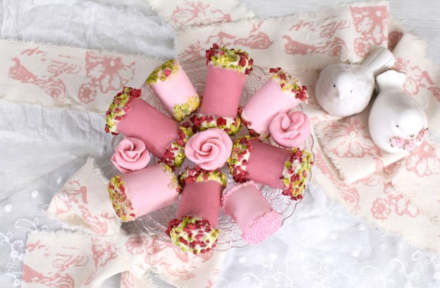 - Die Enden der Röllchen in die Schokolade tauchen und danach in Kokosette (Kokosraspeln) drehen. Alternativ mit Pistazien und Himbeerstückchen garnieren.