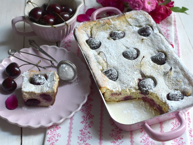 Am besten aber schmeckte der warme Kirschauflauf, den wir Kinder als Hauptmahlzeit serviert bekamen. Ich liebte diese Mehlspeisenfreitage. Der flauschig weiche Auflauf wurde nicht am Blech gebacken, sondern in einer Rein. Einer länglichen mit zwei Griffen. Sie stand im Rohr, bis wir von der Schule kamen. So konnte der Auflauf langsam ausdampfen und blieb dabei warm. Schon damals war es eine Riess-Email-Pfanne, allerdings nicht in den zuckersüßen Pastelltönen wie heute, sondern in der klassischen rostroten Außenfarbe der Nachkriegszeit.