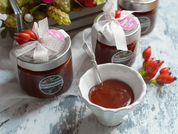Wer zu den Glücklichen mit Duftrosen im eigenen Garten zählt, kann die Rosenblüten – vorausgesetzt sie sind ungespritzt – auch in der Küche verwerten. Rezepte für Rosensirup, Rosengelee, Rosenessig und viele mehr findet ihr hier. Rosenmus bzw. Rosenblütenmus eignet sich zum Verfeinern von Desserts und Süßspeisen, ist aber auch ein ganz besonderes Topping für pikante Vorspeisen und Käseplatten. Habt ihr schon mal Datteln gefüllt mit Blauschimmelkäse probiert? Dazu einen Klacks Rosenmus – ein ganz besonderer Genuss! Für das Rosenmus werden die Duftrosen-Blütenblätter mit Zucker und Zitronensaft fein püriert, mit etwas Wein aufgekocht und mit Pektin haltbar gemacht (zum Rezept).