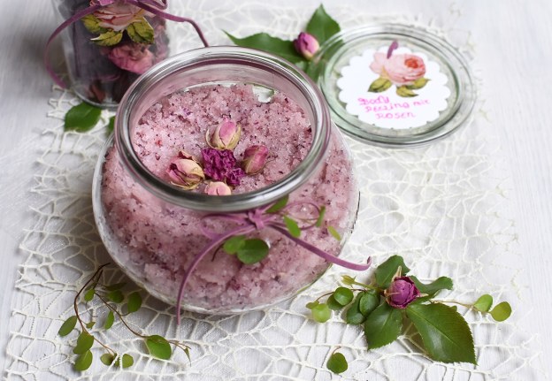 Das angenehm duftende Body-Peeling mit Rosen und ätherischem Rosenöl ist ganz einfach herzustellen. Jetzt, da der Sommer sich langsam verabschiedet und einige Rosen zur Nachblüte ansetzen, ist es höchst an der Zeit, Vorräte anzulegen. Die duftenden Blüten zu trocknen und für die Küche, als Duftsäckchen oder zu Kosmetika zu verarbeiten. Nach dem Urlaub ist die sonnengebräunte Haut meist etwas trocken und schuppig. Zeit für ein gründliches Körper-Peeling. Der absolute Vorteil von DIY-Kosmetika ist, dass man genau weiß, was drin steckt und man der eigenen Haut zumutet. DIY-Rosenkosmetika sind auch wunderbare Mitbringsel.