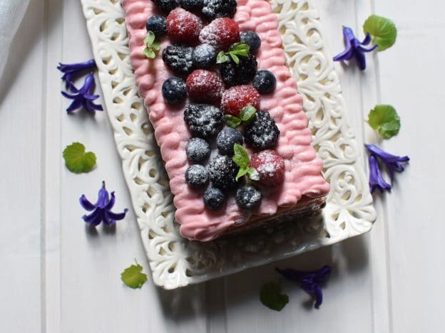 Und anstatt das Obst mit Marmelade zu glasieren, habe ich einen Rosenguss kreiert, der die Kuchenoberfläche ganz besonders schmackhaft macht. Probiert es doch mal.
